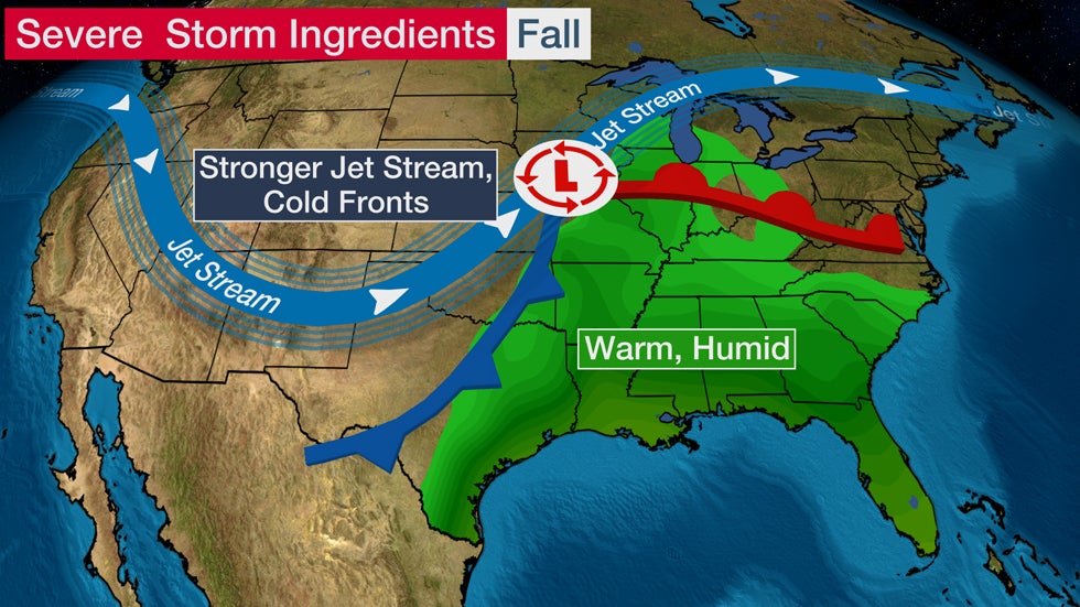 Just like spring, fall is a battleground season when surges of warm, humid air from the Gulf of Mexico sometimes meet up with the increasingly stronger cold fronts and jet stream winds that typically sweep across the country this time of year.